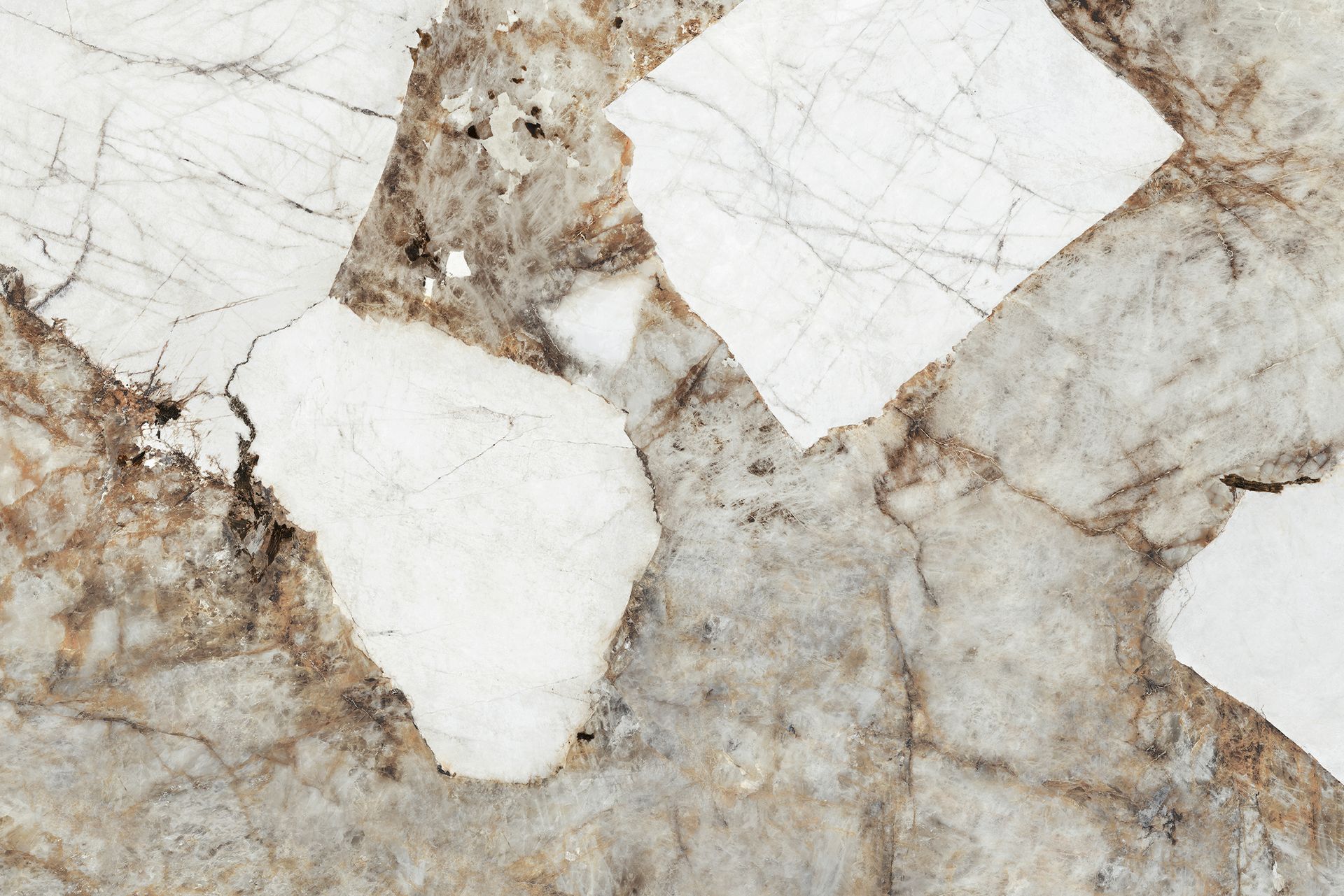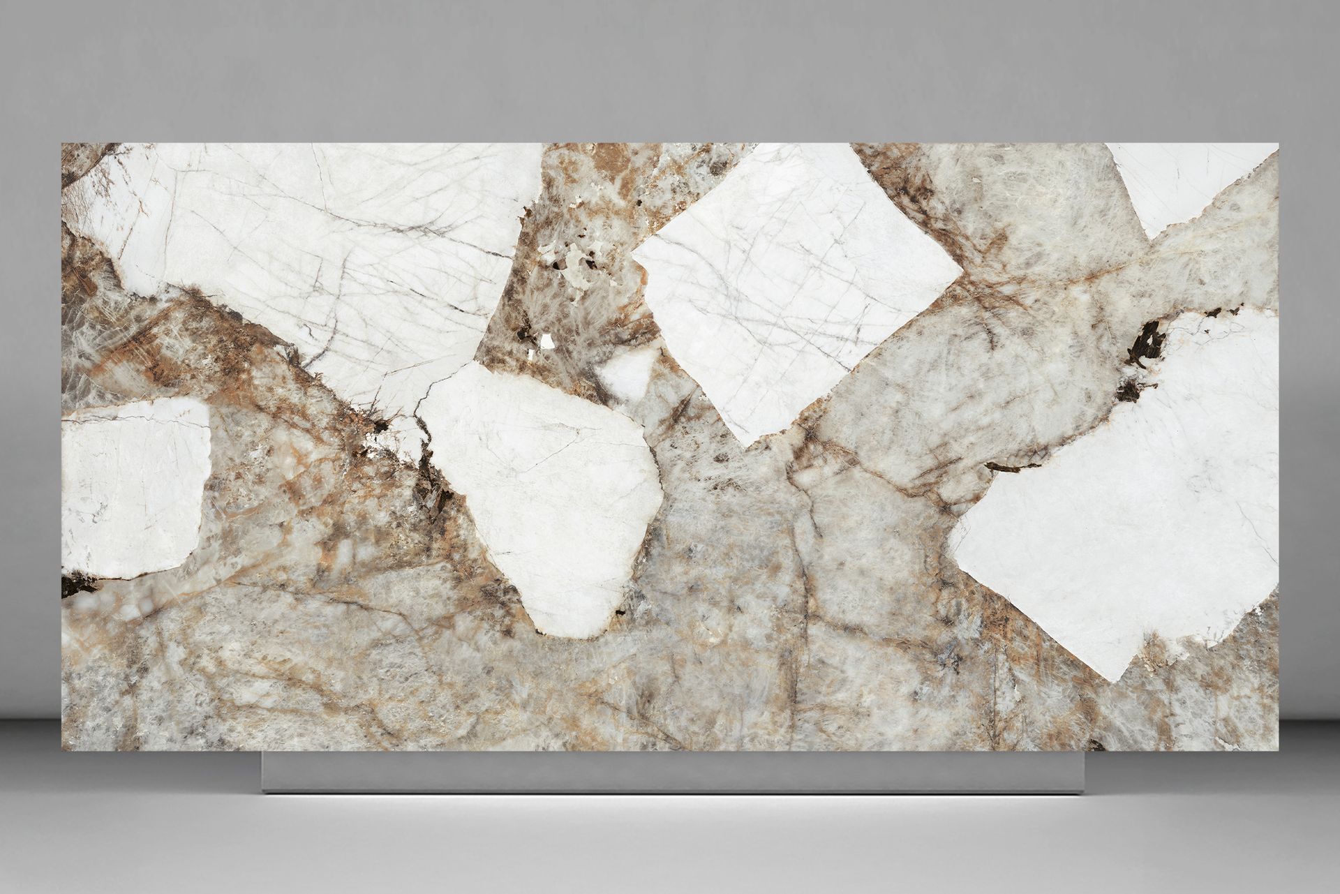 Una superficie imponente y exclusiva de Pura Prima. Con áreas claras se entrelazan con tonalidades doradas y grises, generando un contraste único y lleno de carácter. Su acabado potencia la profundidad y luminosidad de cada fragmento, convirtiéndola en el centro de todas las miradas. Ideal para espacios que buscan lujo natural y distinción absoluta.